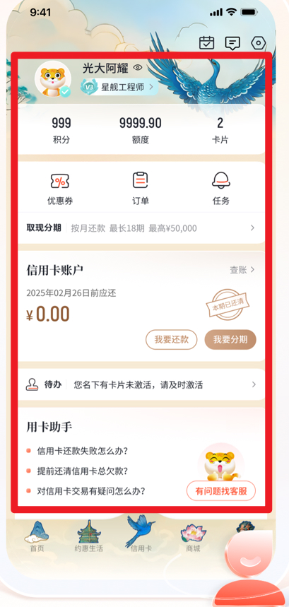 5、进入我的页面,可以清晰看到个人积分、额度及卡片信息,还能快速管理订单、任务和信用卡账单,随时掌握账户动态。