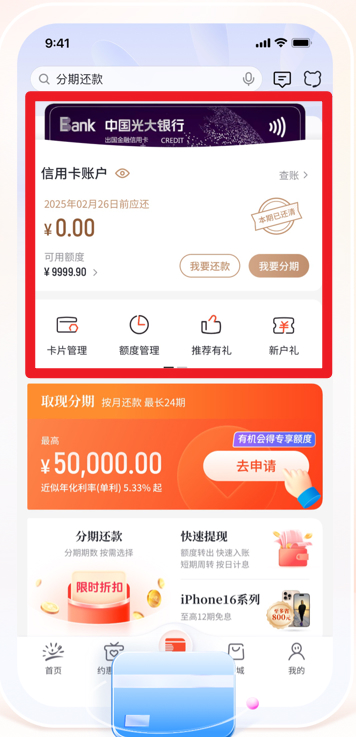 3、信用卡管理页面不仅能查看账单和额度,还能一键申请分期,进行卡片管理与优惠推荐,让信用卡使用更灵活方便。