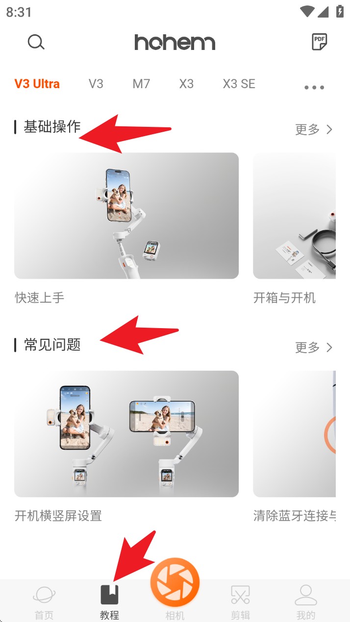 3. 点击底部导航栏的「教学」进入教学专区,可依需求选择「基础操作」或「常见问题」浏览教学内容。