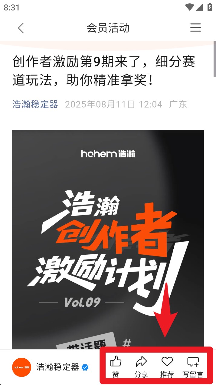 2. 进入会员活动页面后,页面下方会显示点赞、留言、推荐与分享按钮,可根据需要进行互动操作。