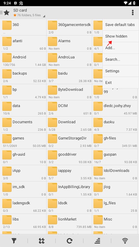 2、在下拉菜单中,点击“显示隐藏文件”show hidden。
