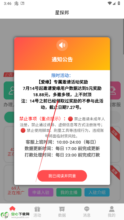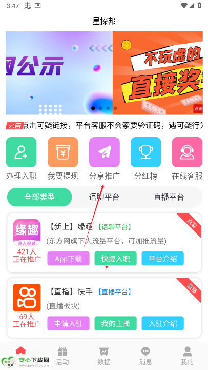 星探邦软件最新版(com.xingtanbang.h5)是一款代理推广平台,在这里面你只需要代理推广各种社交软件,推广它们即可获得收益,任务十分简单,人人都可以参与其中,帮助你简直获得各种收益,非常真实的平台奖励。