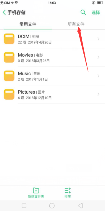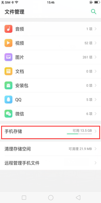 2、在文件管理页面,点击手机存储,到手机存储页面。