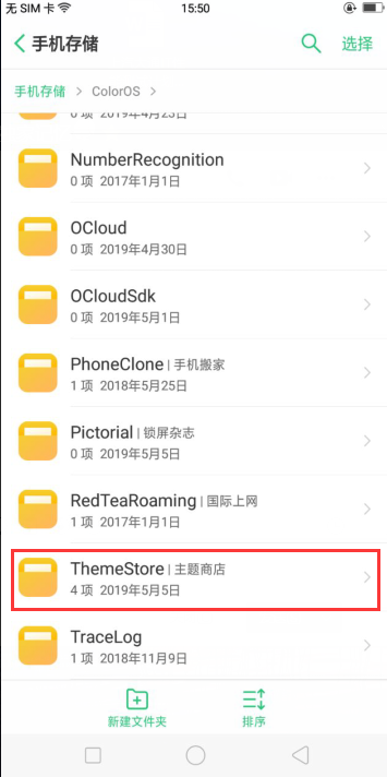 5、打开ColorOS文件夹后,找到ThemeStore(后面有标准主题商店)文件夹,点击打开。