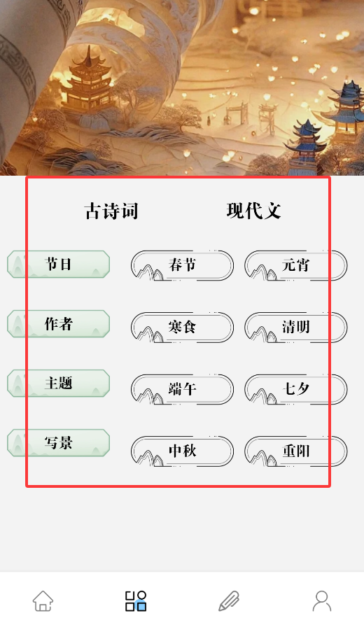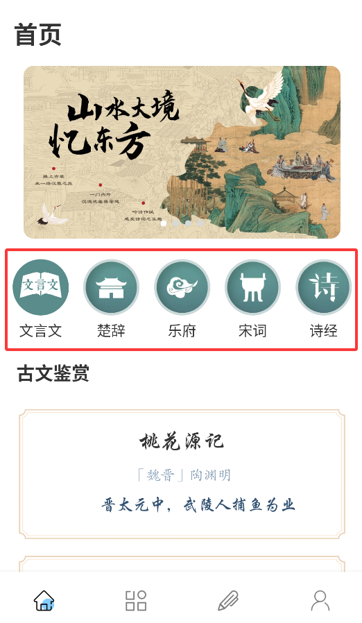 2、首页提供五大经典文学分类:文言文典籍、楚辞选集、乐府诗集、宋词精选和诗经汇编。