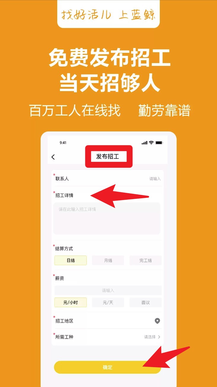 3. 若你是招聘方,可点“发布招工”,填写职位信息与薪资方案后点击底部“确定”即可发布。
