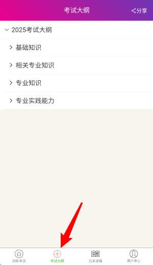 3、“考试大纲”板块详细展示2025考试大纲,包括基础知识、相关专业知识、专业知识及专业实践能力,帮助用户按大纲复习。