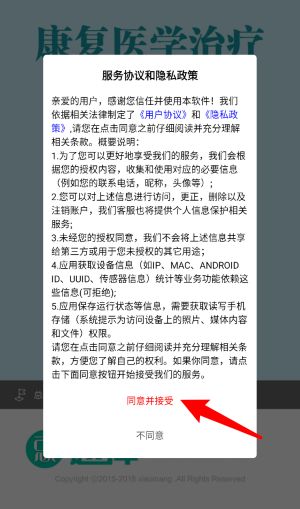 1、首次进入康复医学治疗技术中级总题库应用时,会弹出服务协议与隐私政策,用户需仔细阅读并点击“同意并接受”才可继续使用。
