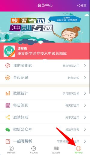 5、“用户中心”页面提供金币记录、数据统计、每日签到、邀请好友、公众号关注等功能,方便用户边学习边获取奖励。
