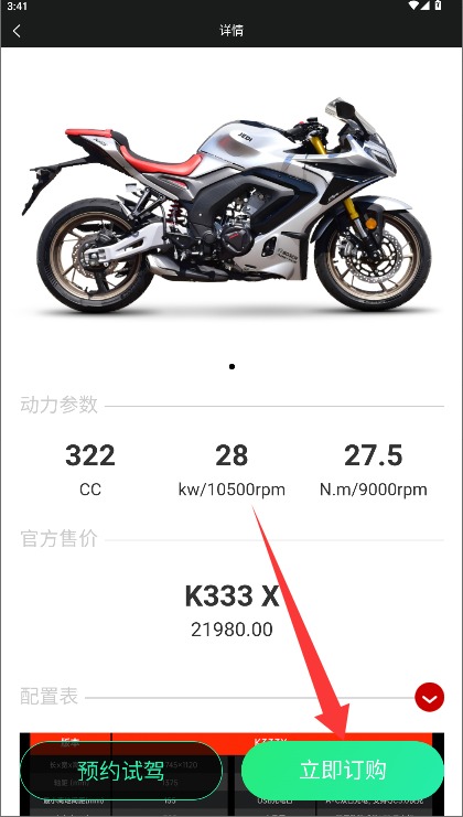 4、进入摩托车详情界面查看详细信息,点击页面右下角"立即订购"按钮付款完成订购。