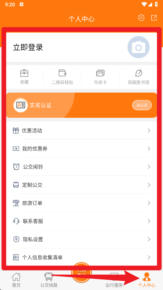 5、在个人中心页面,用户可选择登录或实名认证,解锁优惠券、定制公交等专属服务,并可进行隐私设置和联系客服。