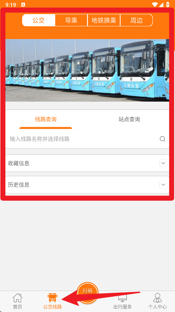 3、在公交线路页面,用户可输入线路名称或站点信息进行查询,还能查看收藏和历史记录,方便快速掌握公交动态。