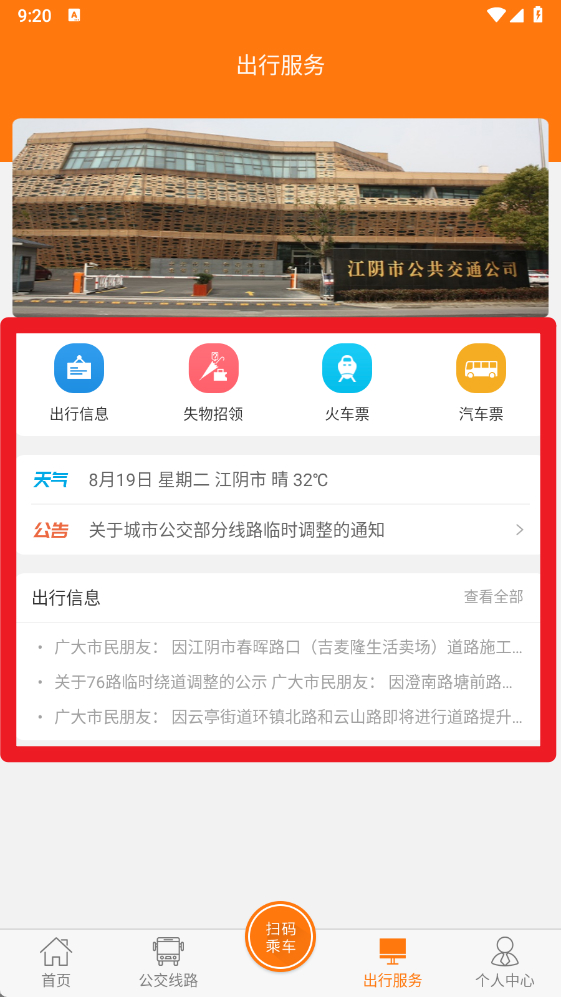 4、进入出行服务界面,可查看出行信息、失物招领、火车票、汽车票等服务,同时还能获取天气与公告提醒,确保出行更安心。