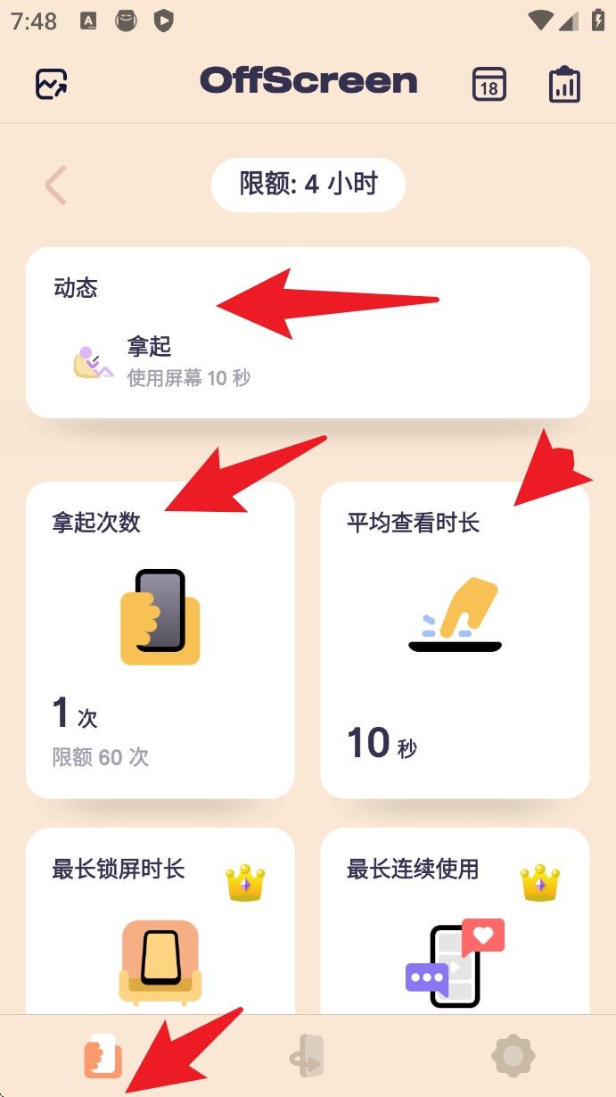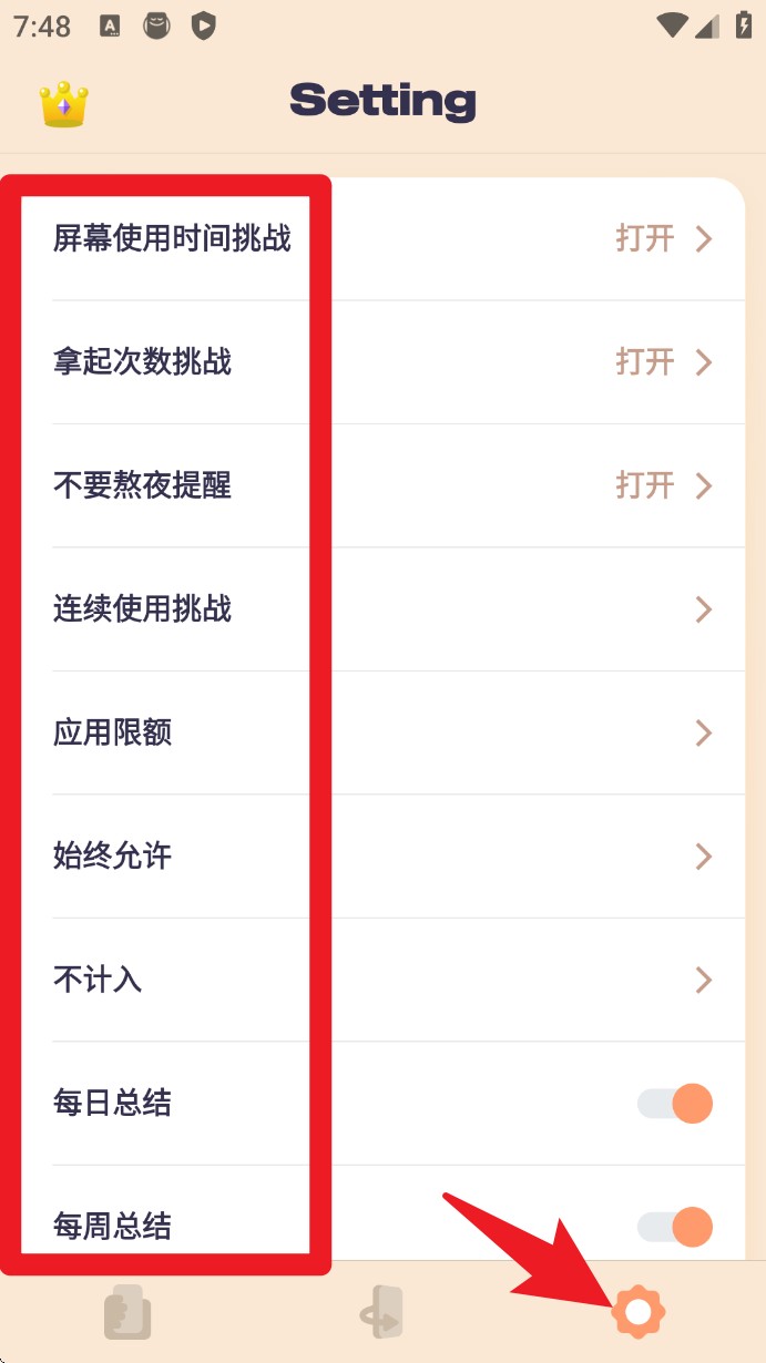 4. 点击底部设置按钮,进入后可开启各类挑战功能,包括使用时长、拿起频次及每日总结提醒等选项。