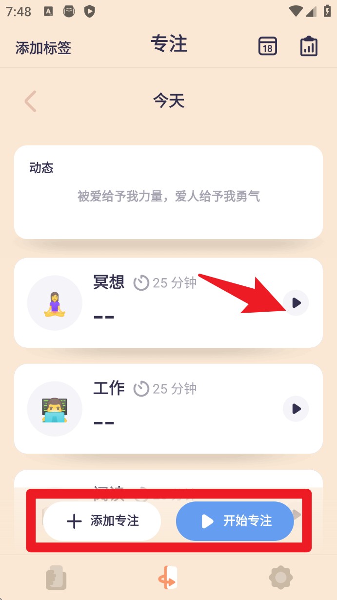 3. 切换到底部中间标签页「专注」,可选择已有专注项目,如冥想、工作,并点击右侧播放键开始计时。
