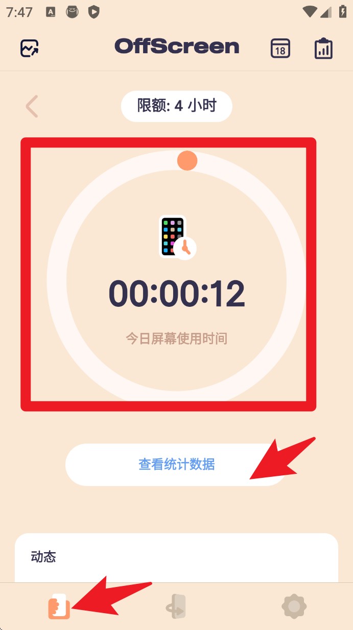 1. 打开 App 后会显示今日屏幕使用时间,点击下方「查看统计数据」即可进入更详细的使用记录界面。