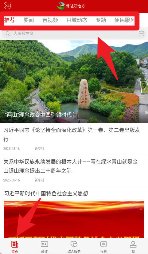 2、首页导航栏涵盖推荐、要闻、音视频、县域动态、专题、便民服务等栏目,帮助用户快速找到所需资讯。