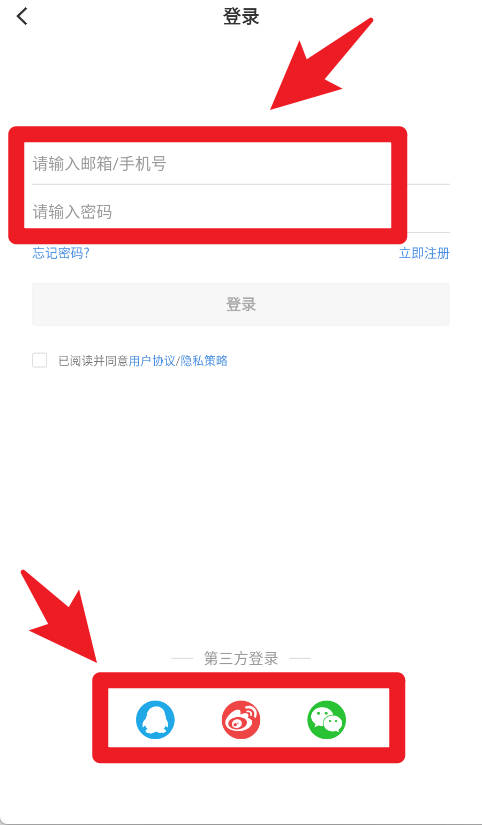 1、在登录界面,用户可输入邮箱或手机号加密码完成登录,也可选择QQ、微博、微信等第三方账号快捷登录,方便高效。