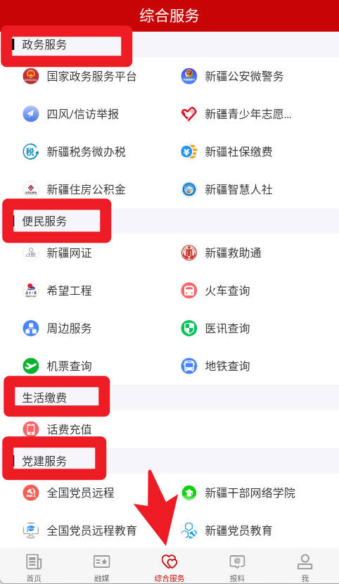 4、综合服务中包含政务服务、便民服务、生活缴费及党建服务等,满足用户在工作和生活中的多方面需求。