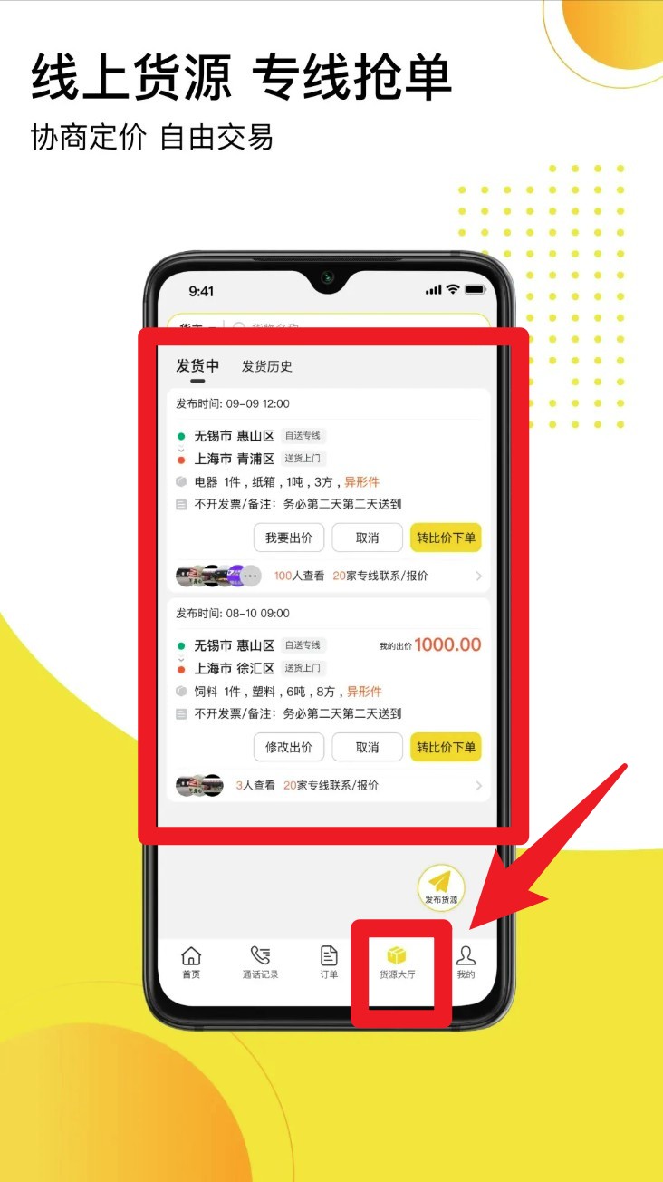 5. 若需查看已发货信息,可点击底部菜单栏「货源大厅」,在「发货中」列表中管理当前订单及报价情况。