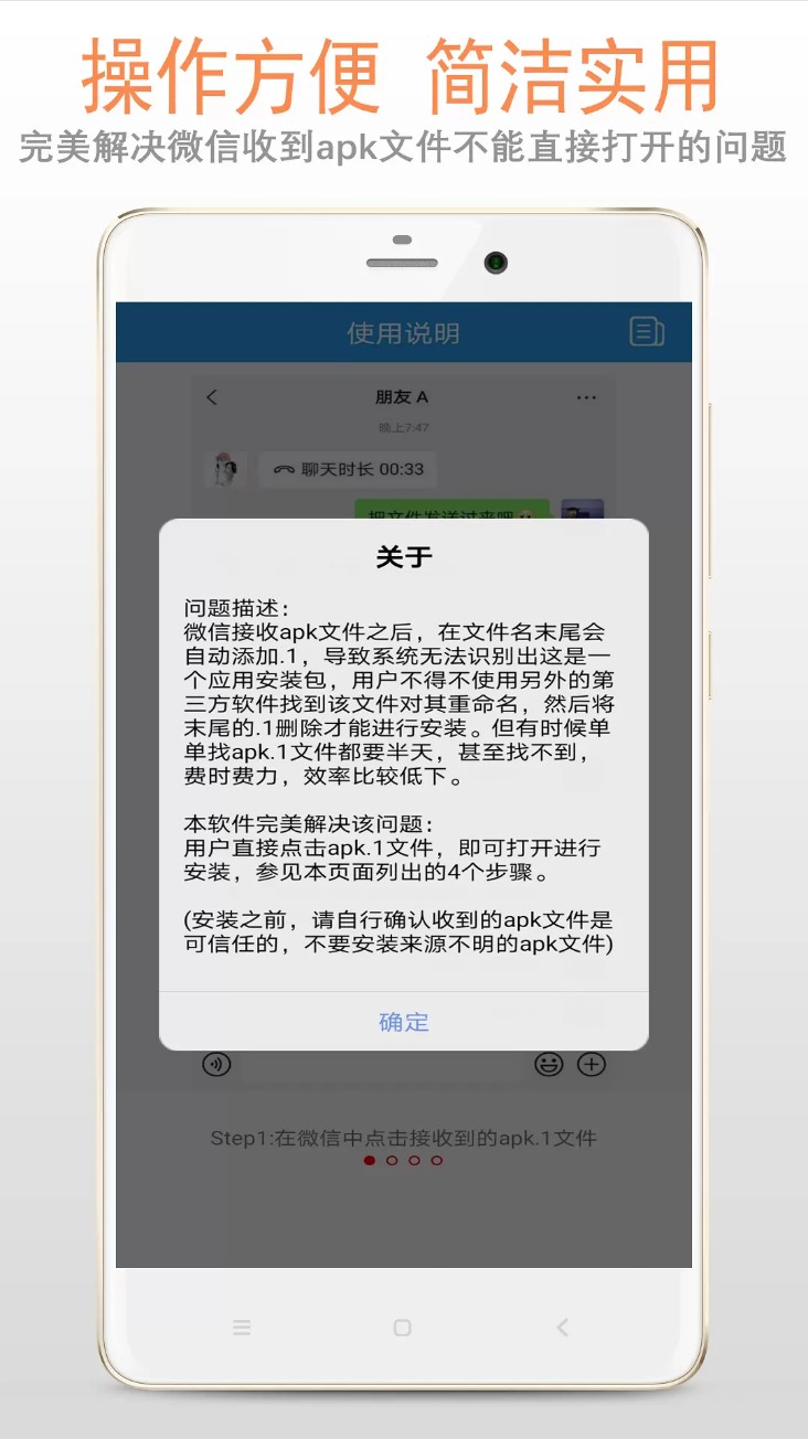 完美解决微信收到apk文件之后无法打开的问题!微信接收apk文件之后,在文件名末尾会自动添加.1,导致系统无法识别出这是一个应用安装包,用户不得不使用另外的第三方软件找到该文件对其重命名,然后将末尾的.1删除才能进行安装。但有时候单单找apk.1文件都要半天,甚至找不到,费时费力,效率比较低下。本应用完美解决该问题:用户直接点击apk.1文件即可打开进行安装。