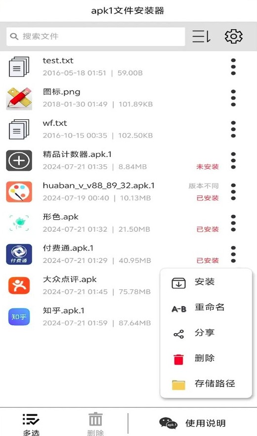 4. 在 apk1 安装器首页中可查看已下载的所有“.apk.1”与“.apk”文件,长按可进行安装、重命名或删除操作。