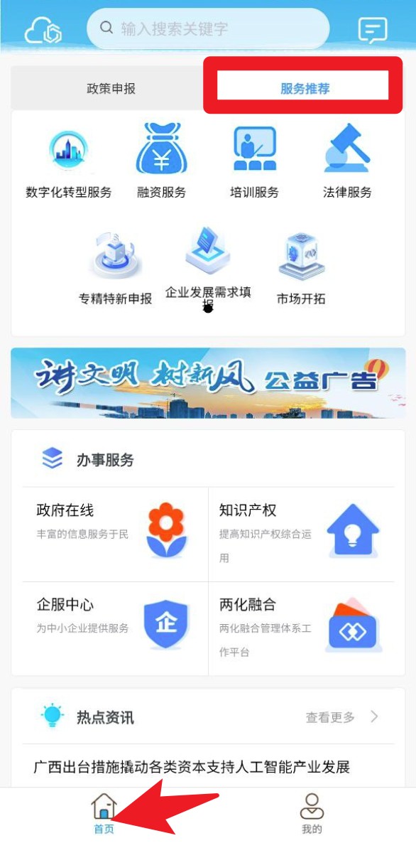 1. 进入 App 首页后,默认位于「政策申报」标签页,点击顶部横排切换栏中的「服务推荐」选项,切换至推荐服务板块。