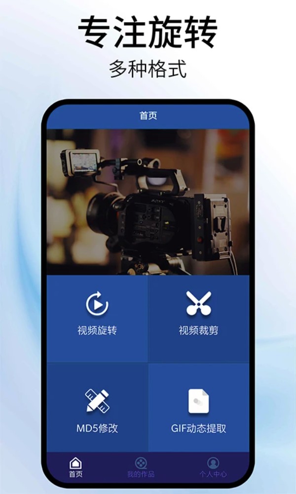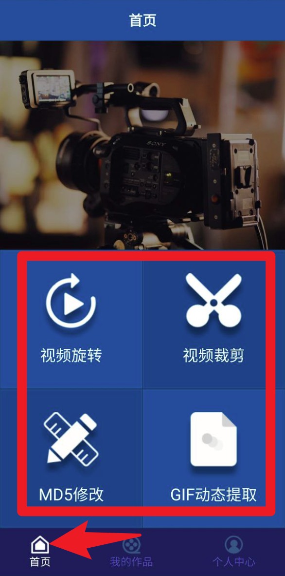 1. 进入 App 后默认停留在首页,可点击「视频旋转」、「视频裁剪」、「GIF提取」等功能模块进行视频处理。