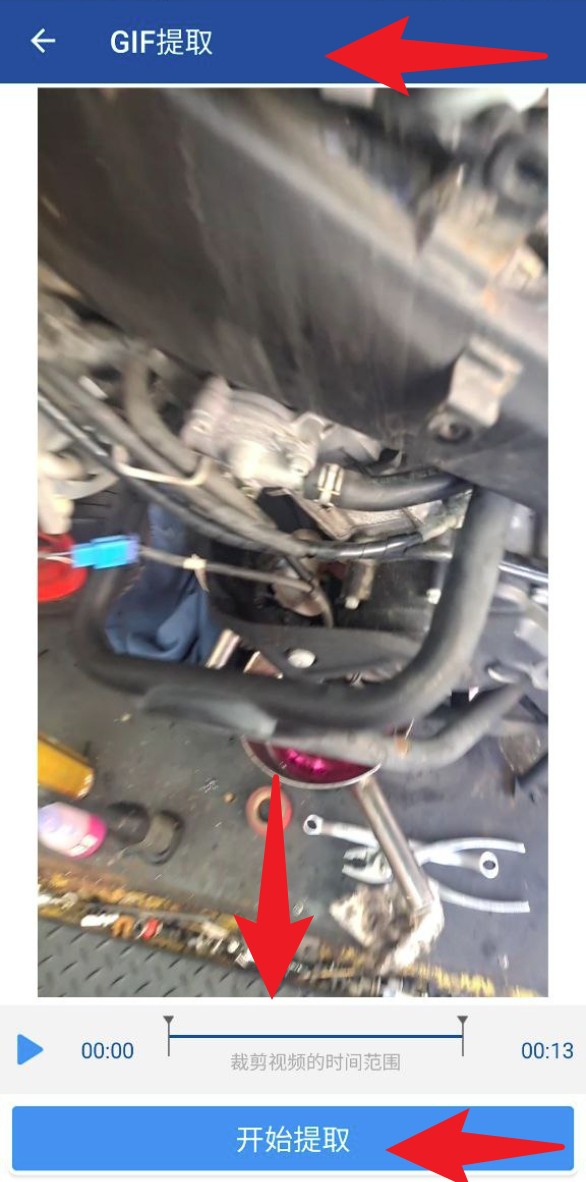 2. 若选择 GIF 动态提取功能,导入视频后拖动进度条裁切时间范围,并点击「开始提取」生成 GIF 文件。