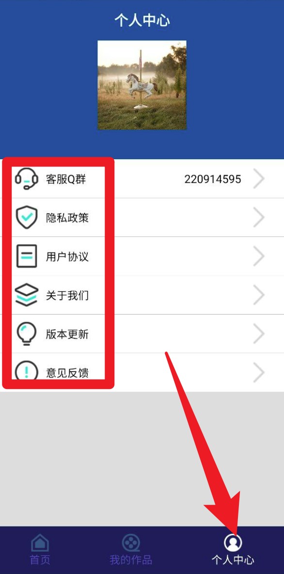 5. 点击底部的「个人中心」进入账号信息页面,可查看隐私政策、版本更新、联系客服等功能入口。