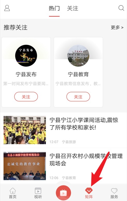 4、点击底部“矩阵”按钮,关注宁县发布、宁县教育等官方账号,获取定制化信息与权威发布内容。