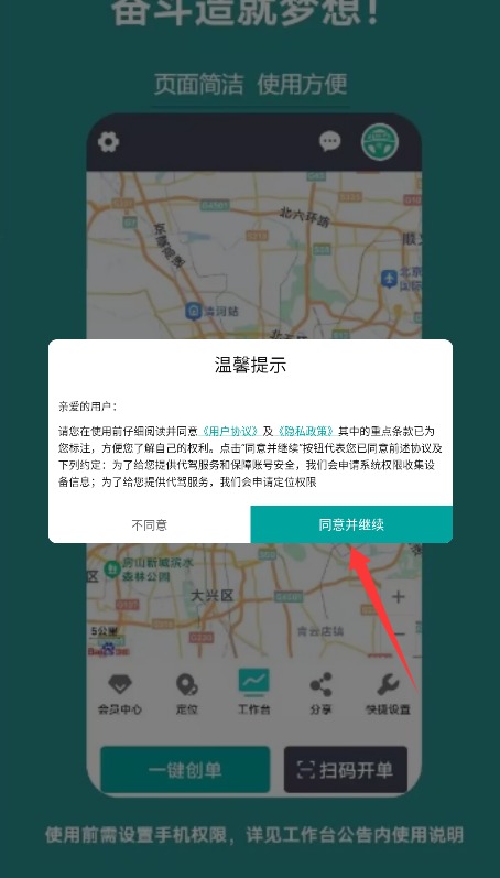 1、初次使用需阅读平台服务条款与隐私政策,确认后点击同意并继续进入应用。