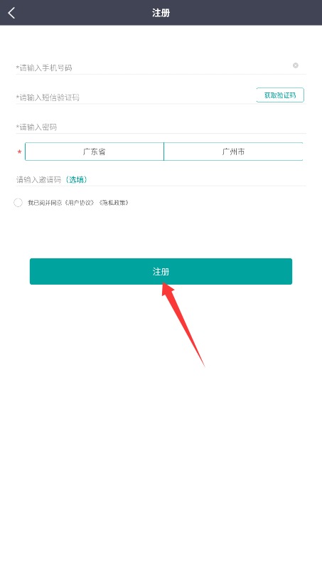 3、填写手机号获取验证码,设置密码选择所在地区并勾选同意协议后,点击确认完成注册流程。