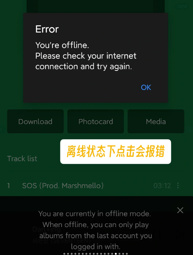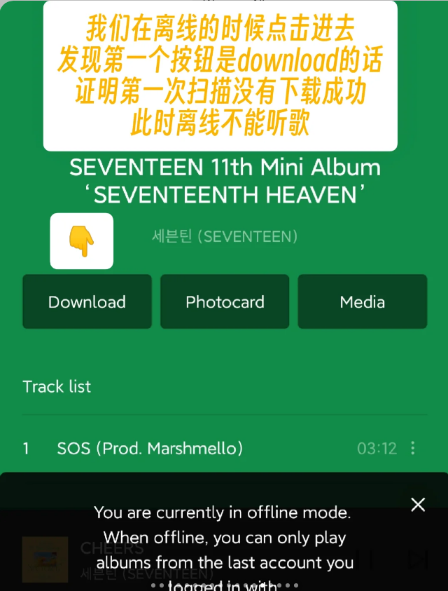 11、我们在离线的时候点击进去,发现第一个按钮是download的话,证明第一次扫描没有下载成功,此时离线不能听歌